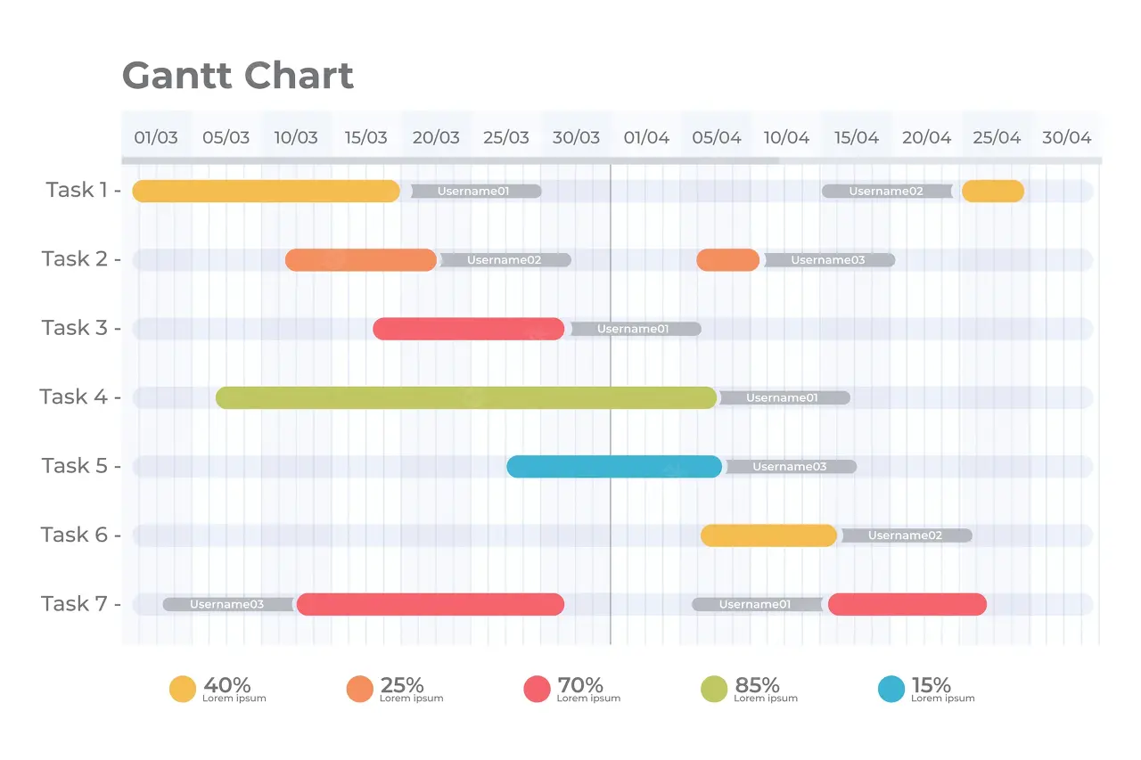 Gantt 차트에는 일반적으로 작업 이름, 작업 기간, 시작 및 종료 날짜, 작업 간의 종속성 및 진행 상태. 프로젝트 관리자가 잠재적인 일정 충돌을 식별하고 진행 상황을 모니터링하며 이해 관계자에게 프로젝트 상태를 전달하는 데 유용합니다.